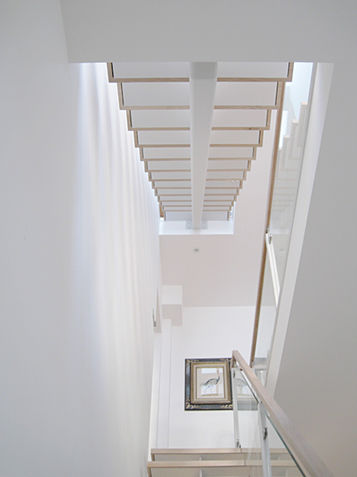 Originally very dark and badly laid out, this mews house has been radically transformed into a modernised series of light-filled spaces organised around a new central staircase. The spine of the staircase, characterised by floating timber treads and glass balustrade, not only physically links all three floors, it draws light from the long row of roof lights above to the spaces below.